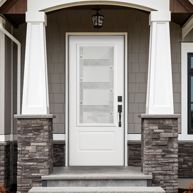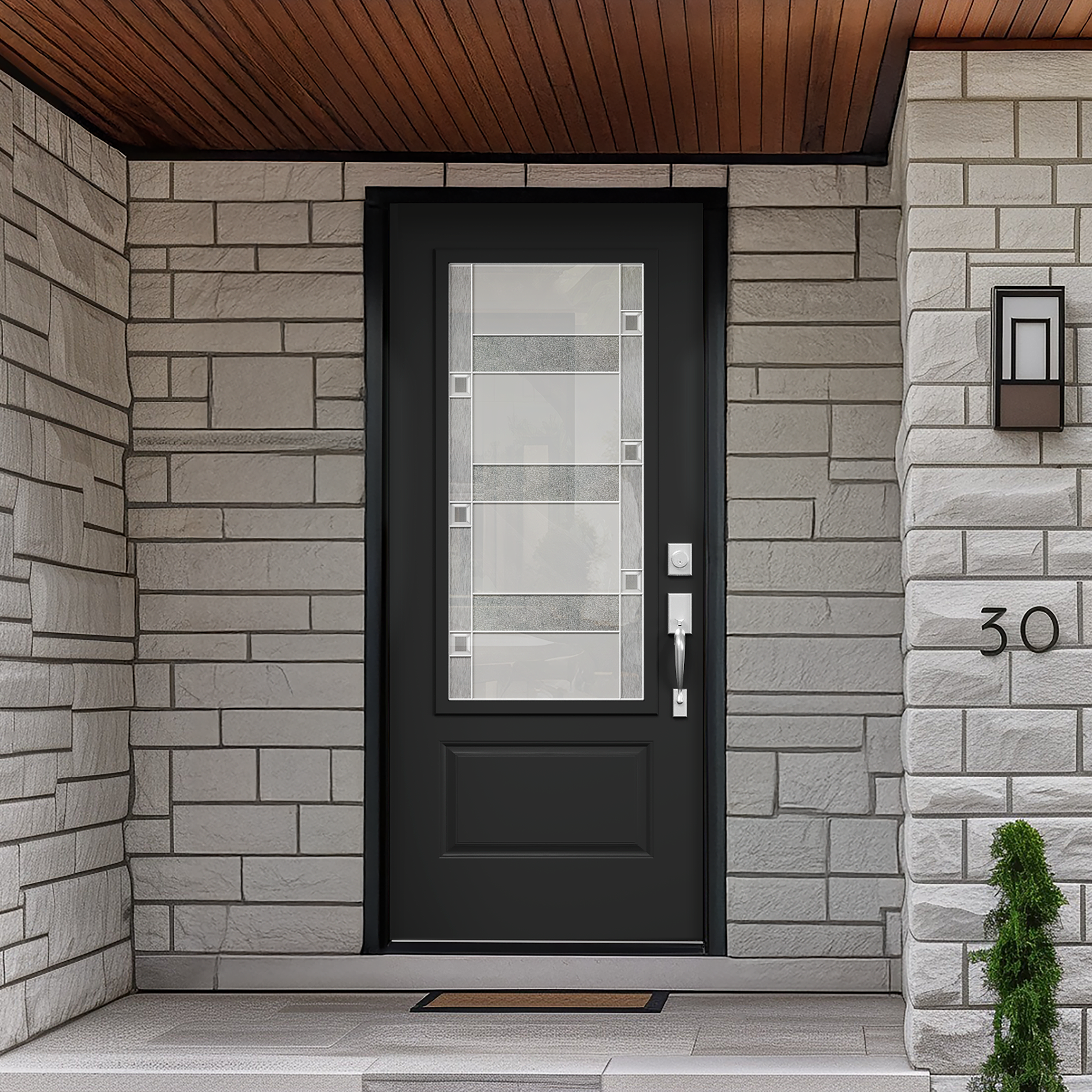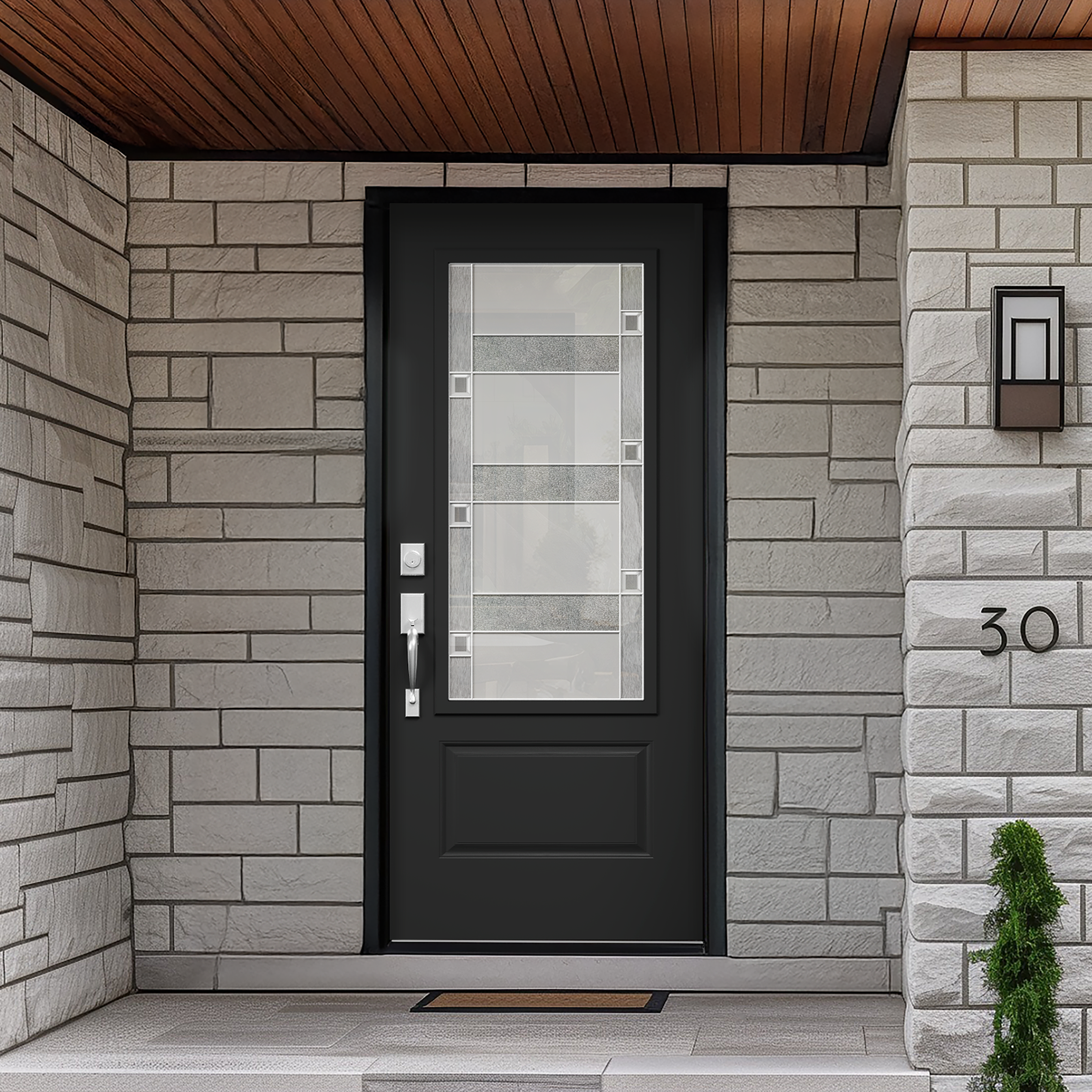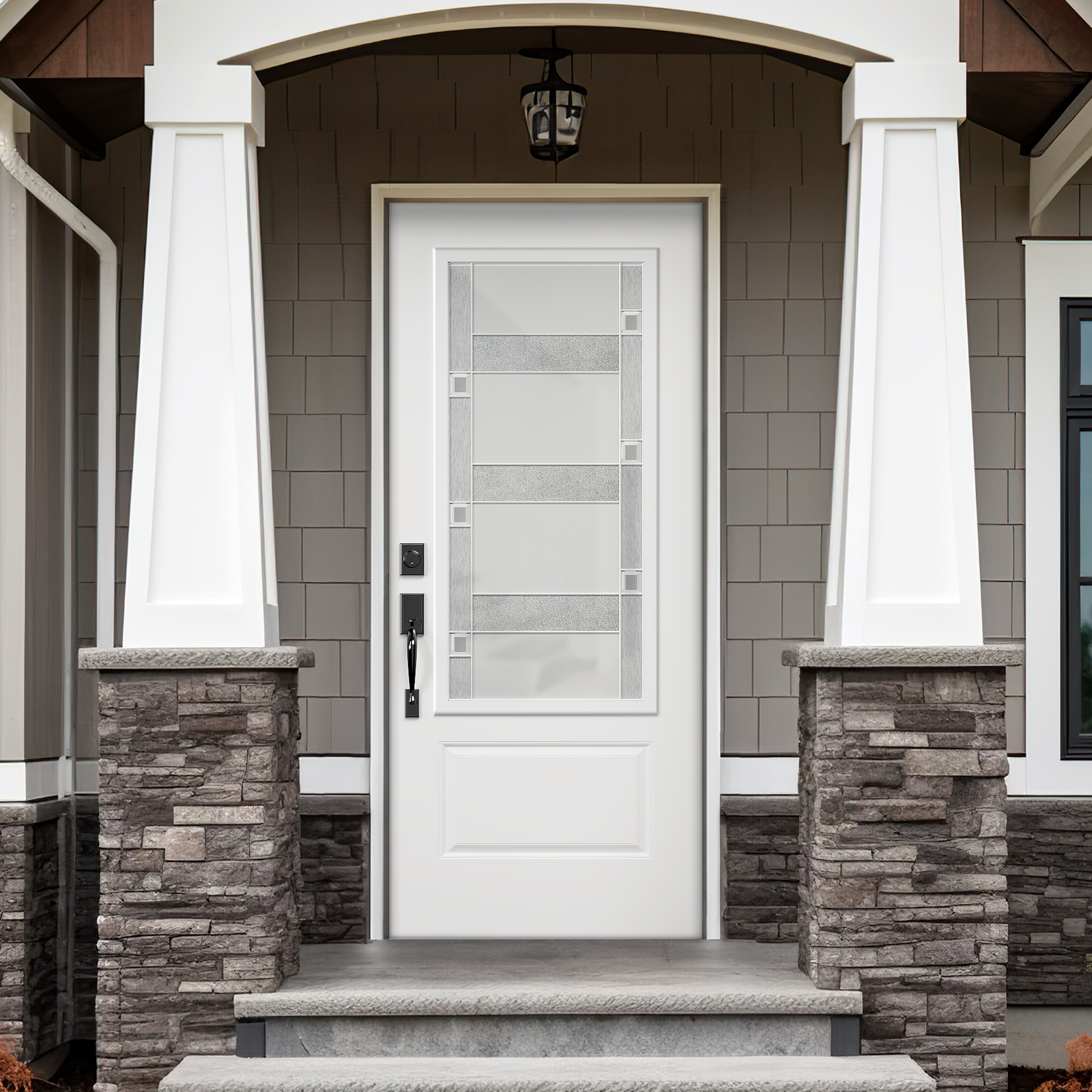 This glass door showcases a full modern cubist design, with sharp angles and geometric shapes that create a sleek, structured look. The clean lines and abstract patterns bring a sense of order and contemporary style to any space. Its minimalist approach adds subtle sophistication, making it a perfect choice for those who appreciate modern, artistic design. Ideal for interiors that embrace simplicity and innovation.