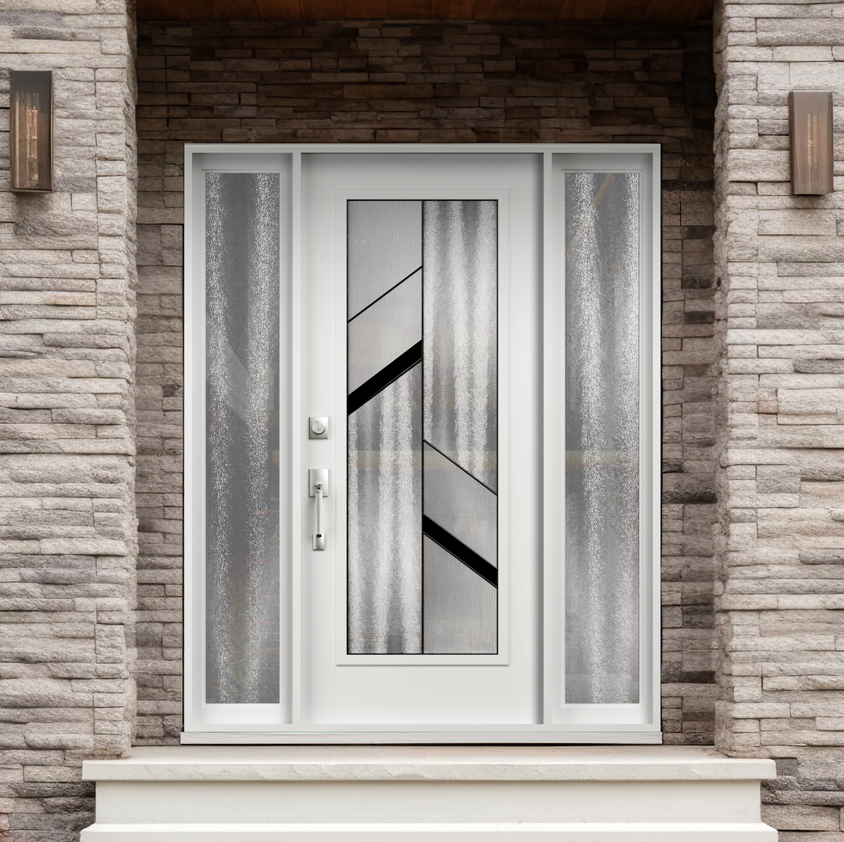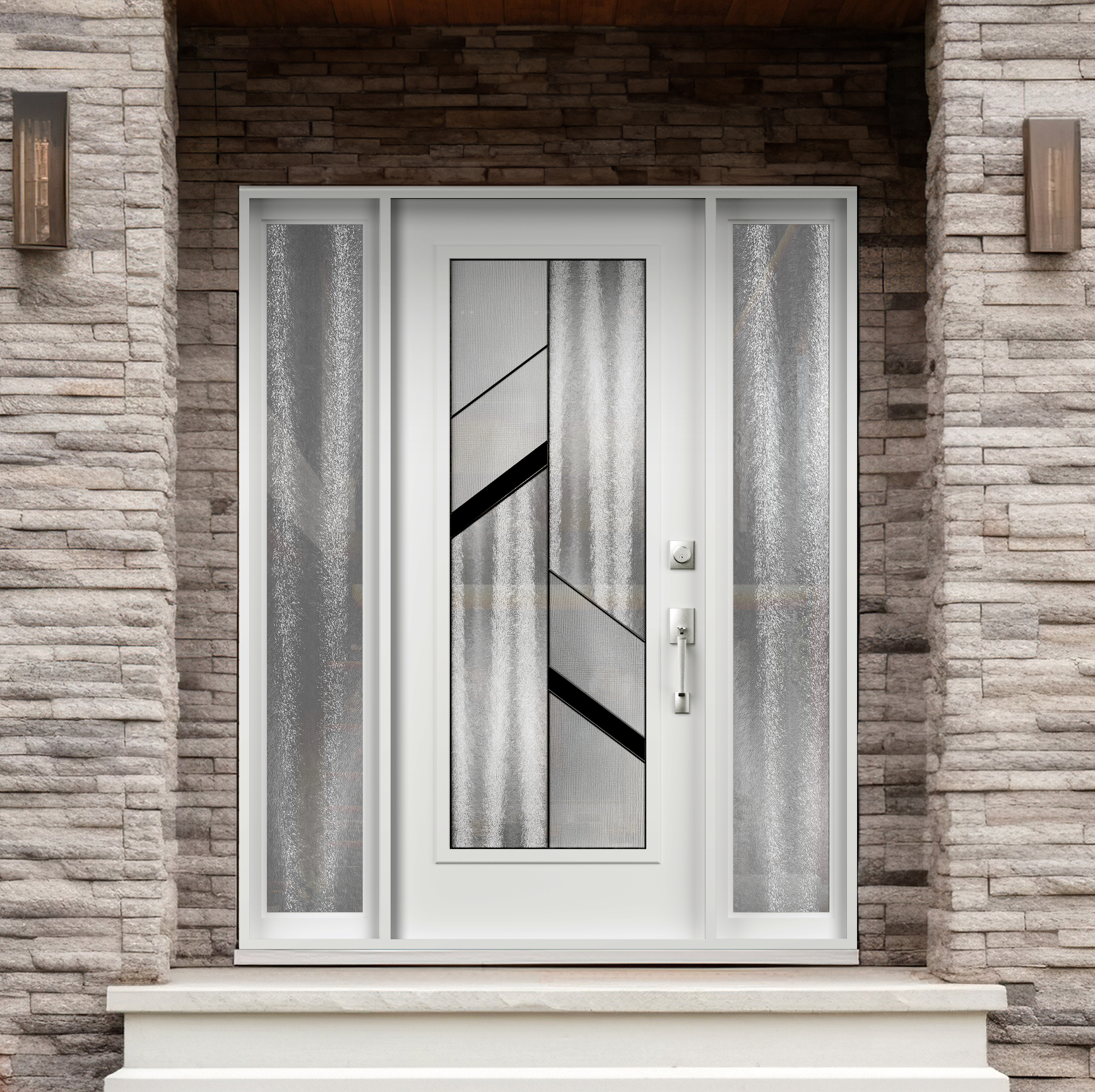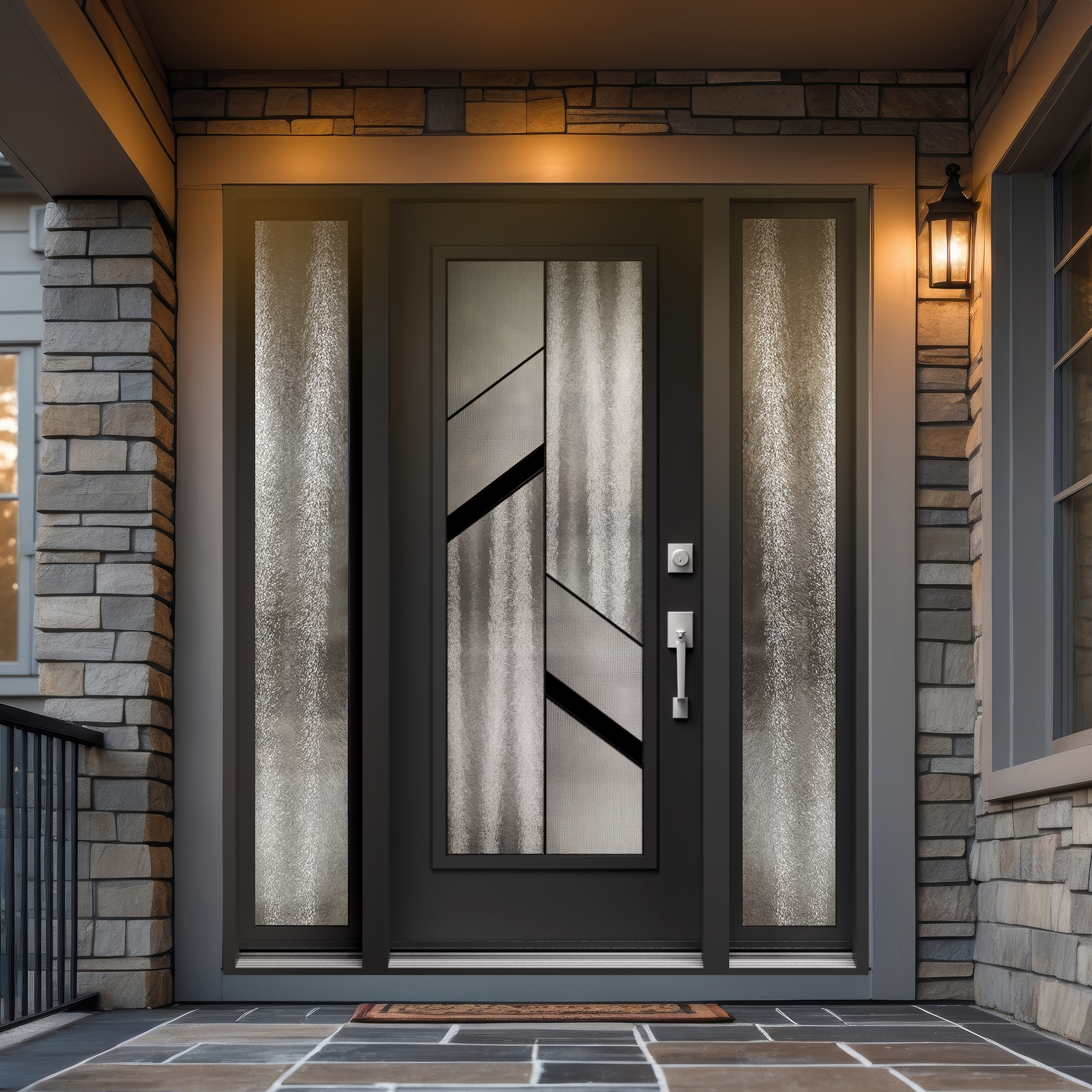 This modern glass door features clear glass panels framed by diagonal black glass accents. The angled black design adds a dynamic, contemporary touch, creating a bold contrast with the transparency of the clear glass. The sleek lines enhance both style and privacy. It’s an eye-catching option for any modern interior or exterior.