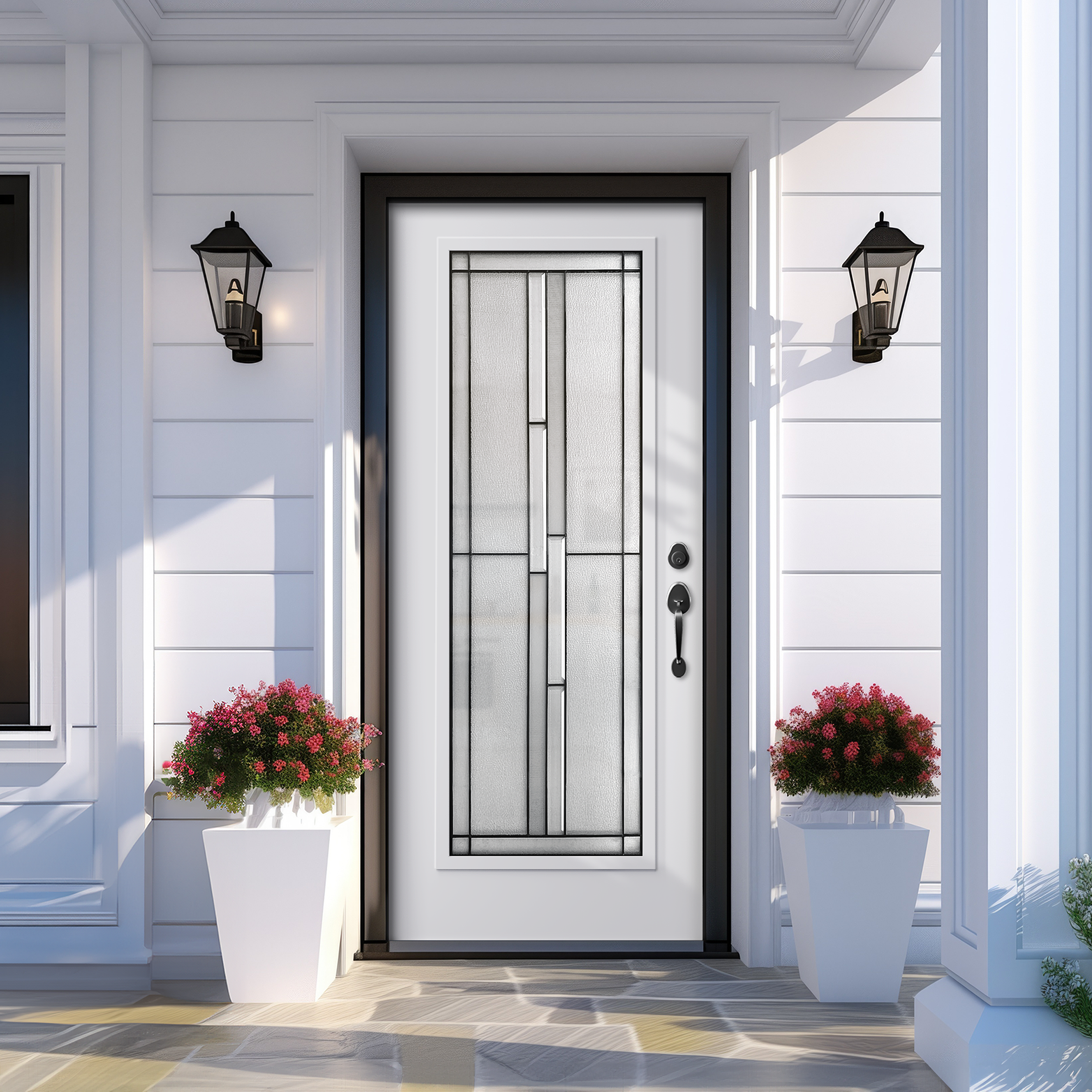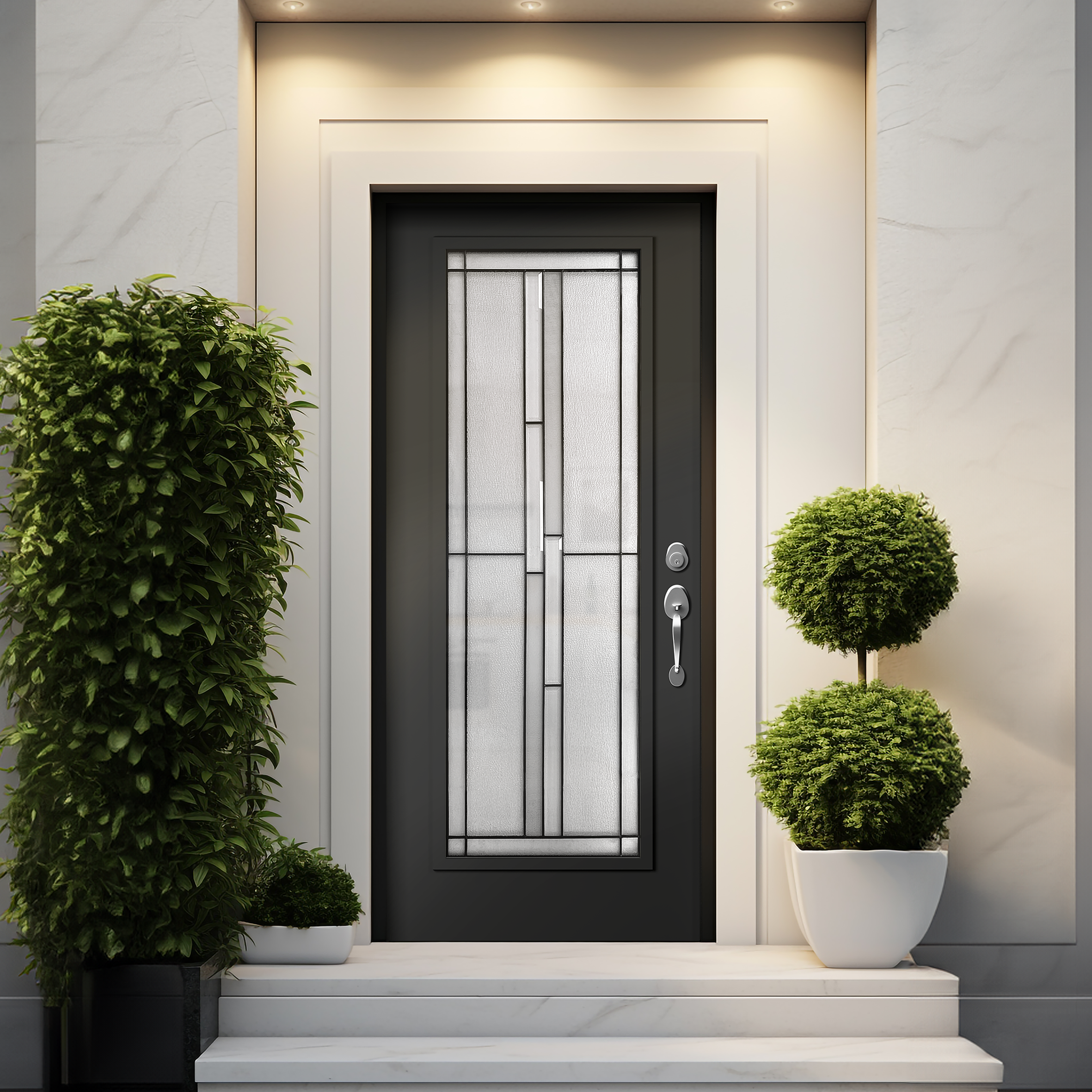 Elio is a true statement piece, exuding sophistication and a contemporary flair that effortlessly complements a variety of home styles, from classic to modern. Its timeless geometric design features vertical columns of patterned bevels and textured glass, creating a dynamic interplay of light and shadow. These elements are beautifully framed by privacy-enhancing textures and rich patina caming, which not only add visual depth but also ensure a sense of seclusion without compromising on elegance.