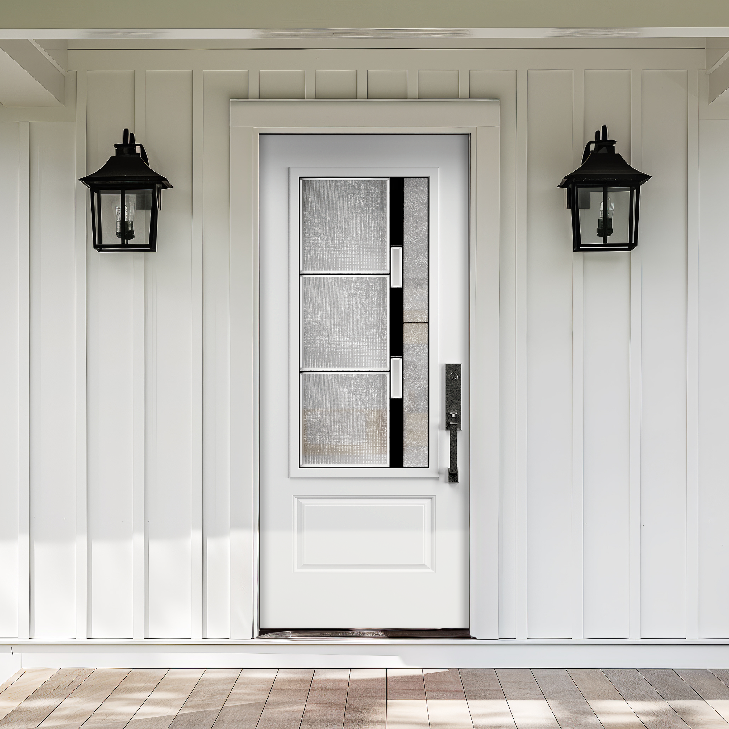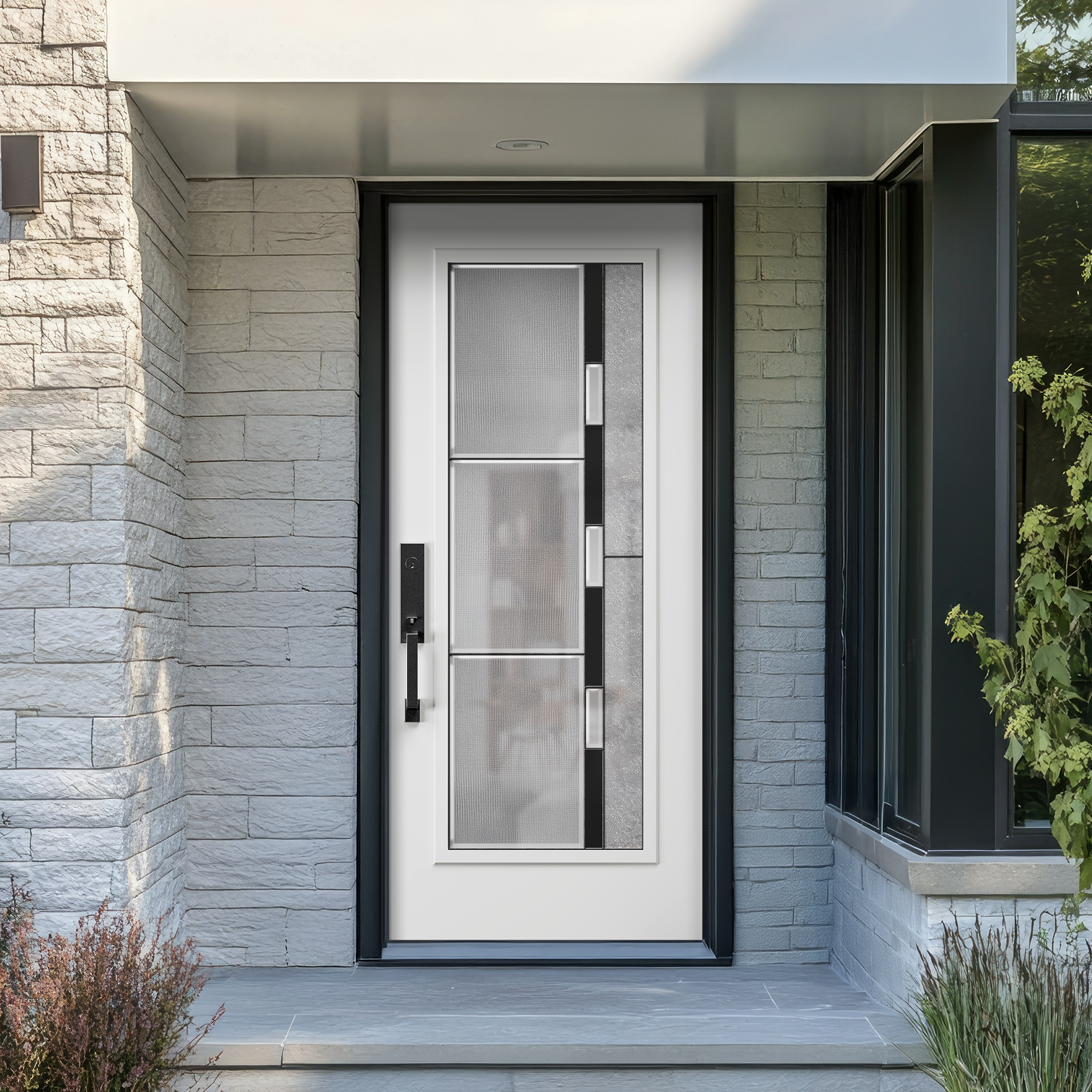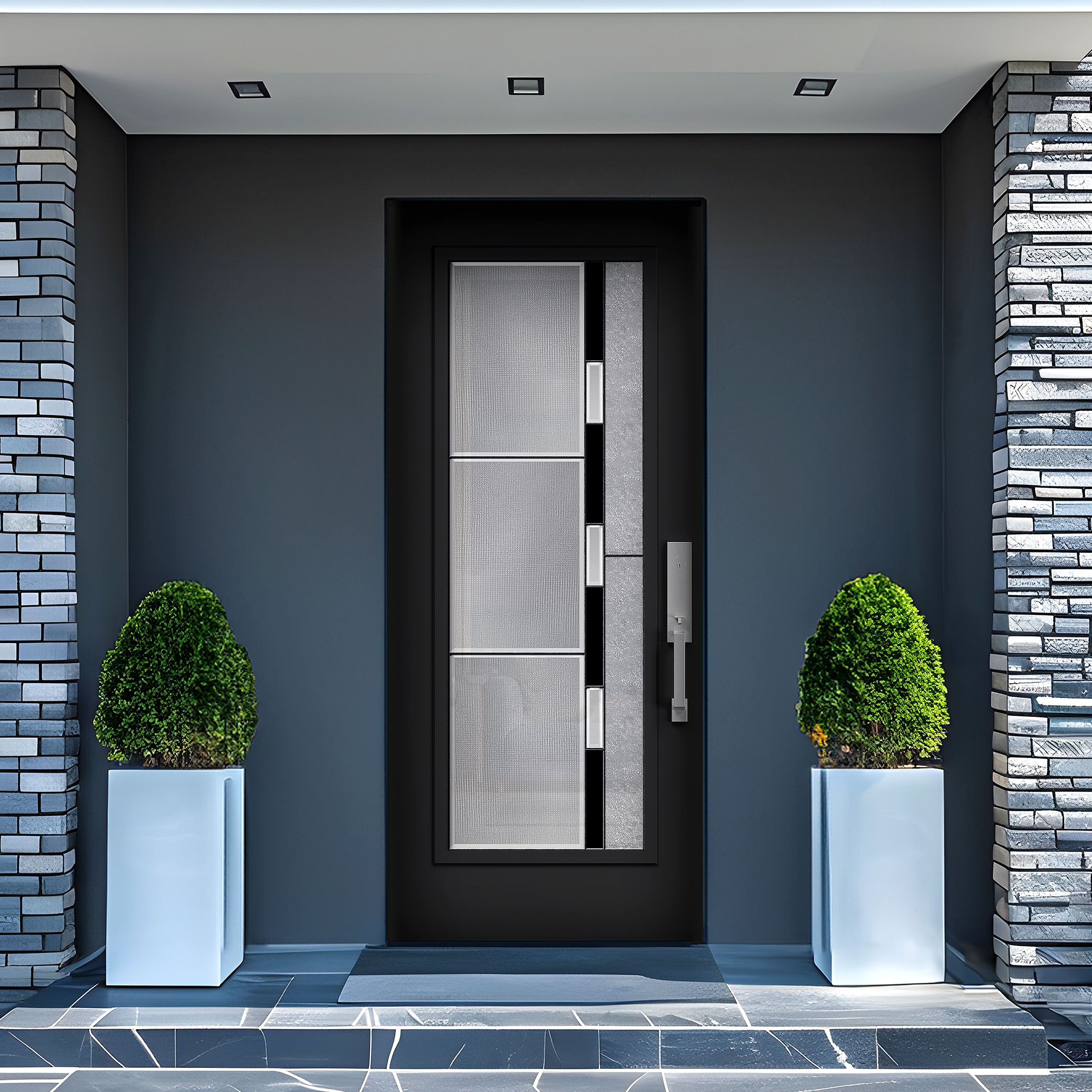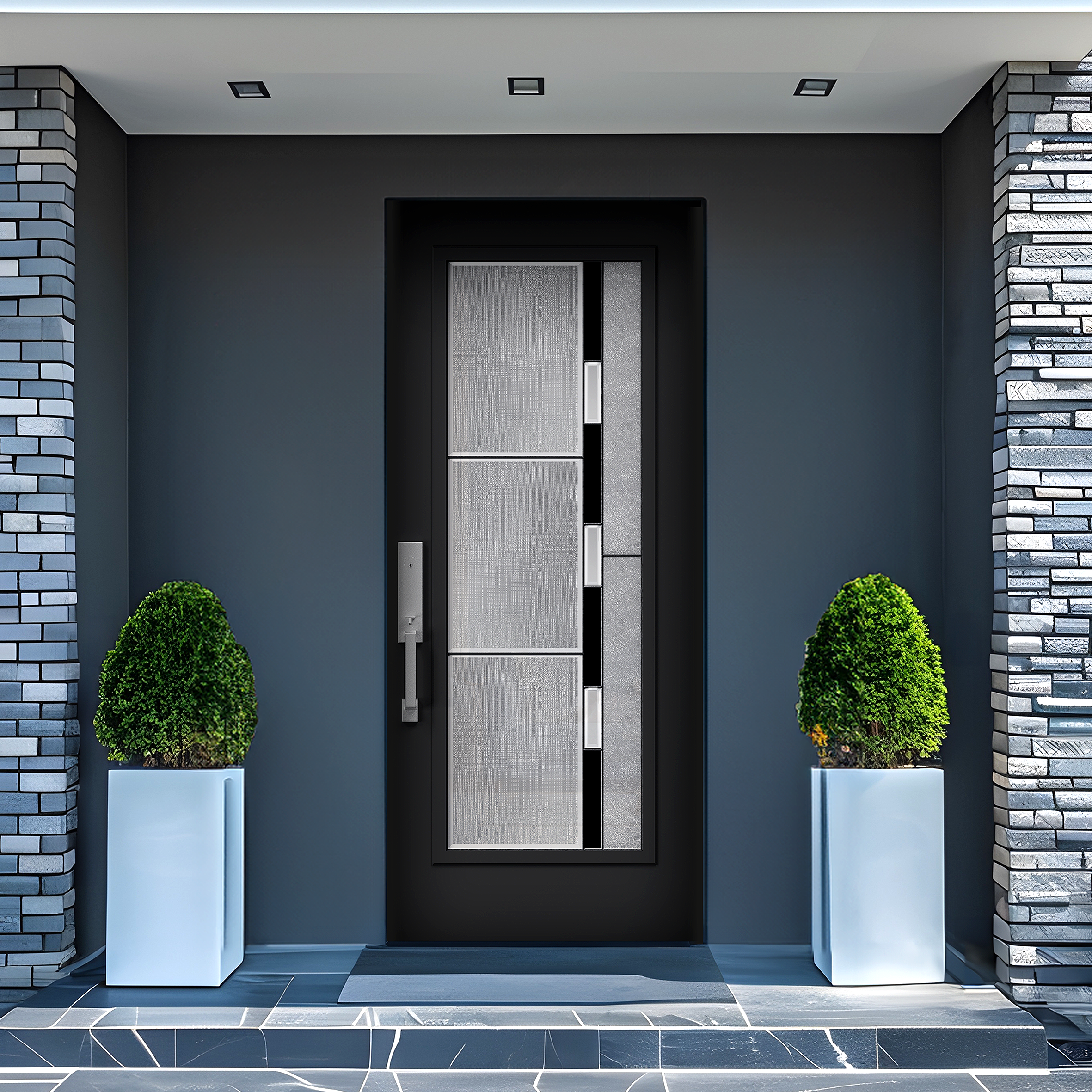 This sleek glass door features a small vertical black line on one side, complemented by clear grey glass accents. The subtle black detail adds a touch of modern elegance, while the grey glass softens the overall look. The design strikes a perfect balance between style and simplicity. It’s an ideal choice for creating a contemporary, sophisticated atmosphere.