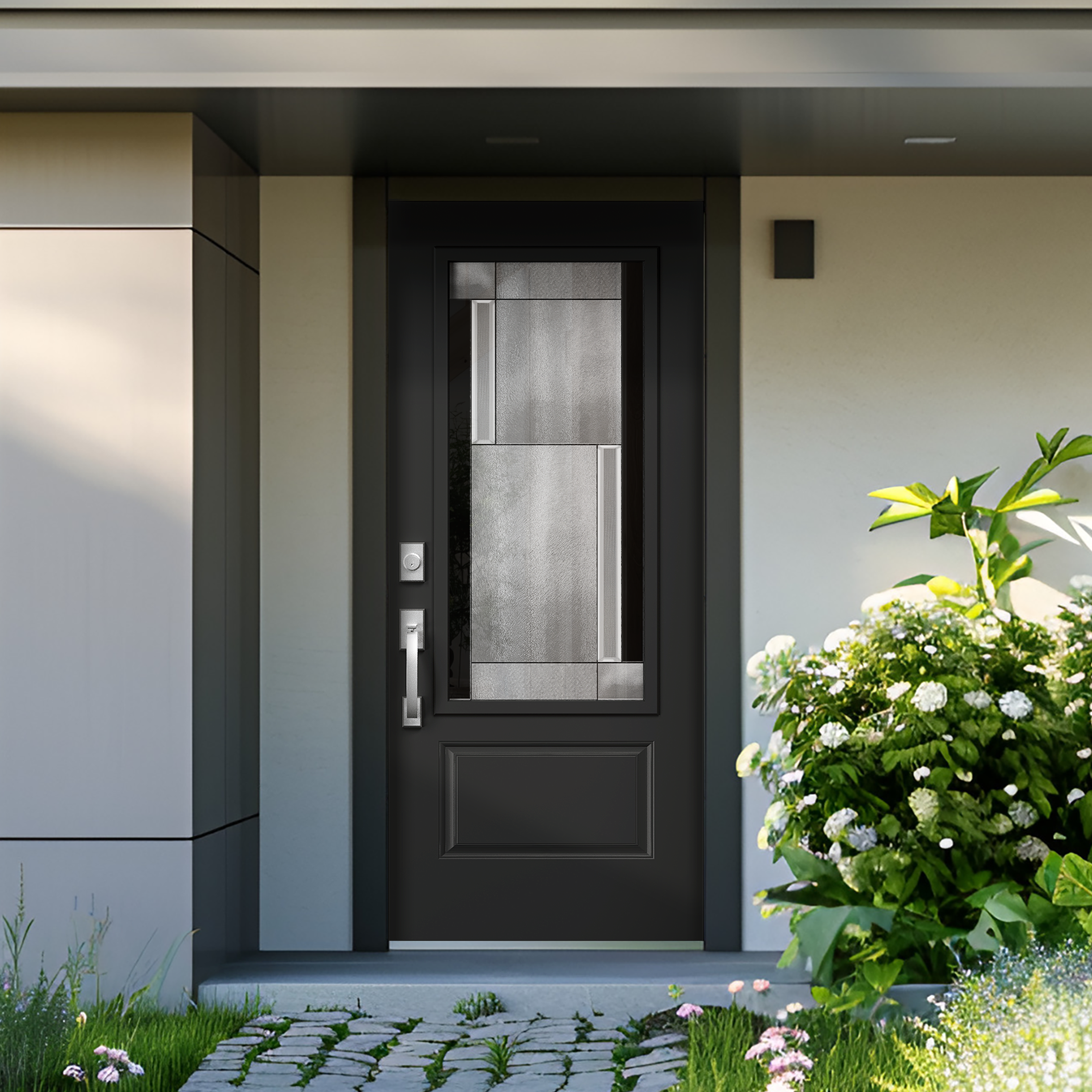 Cette porte contemporaine en verre présente des panneaux de verre clair avec des accents en verre noir élégants de chaque côté. Le design allie ouverture et contraste marqué, créant une esthétique moderne. Le verre noir ajoute une touche de sophistication tout en offrant une intimité subtile. C’est un choix élégant pour tout espace moderne.
